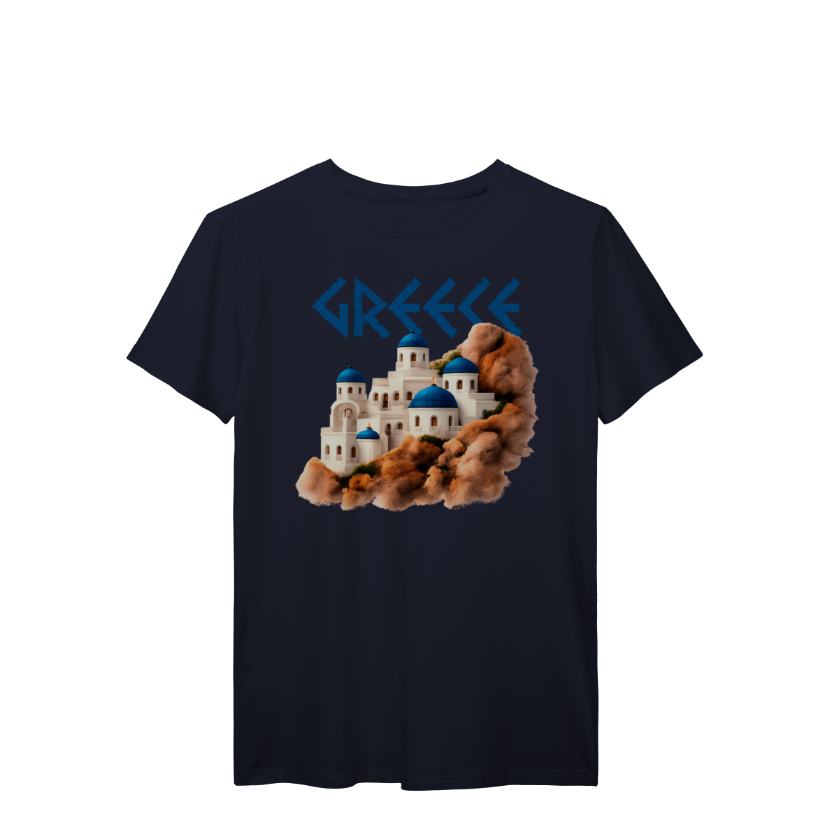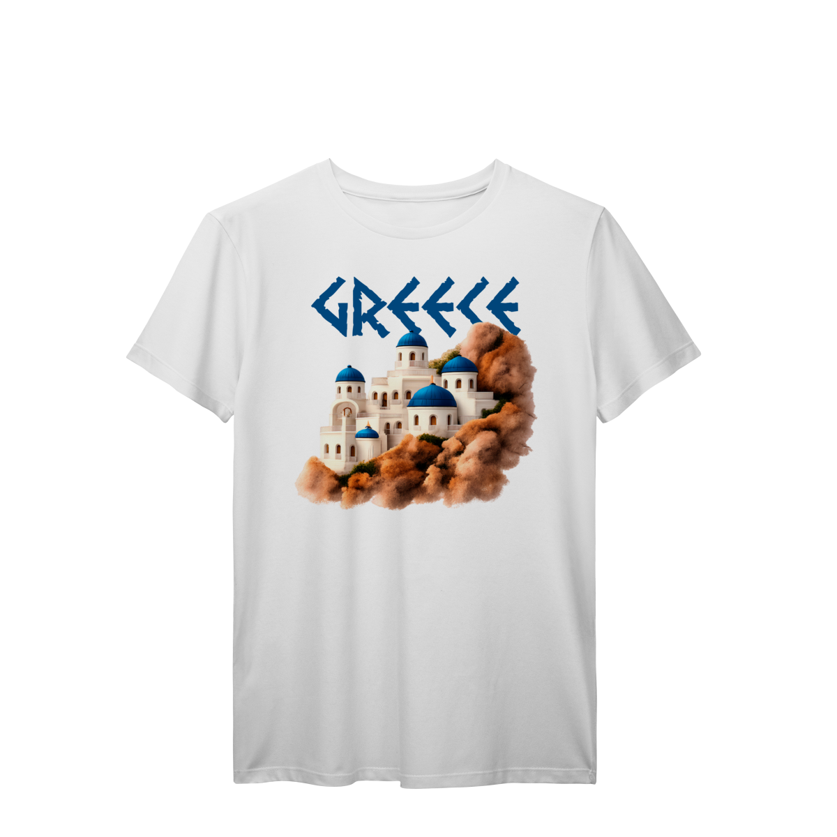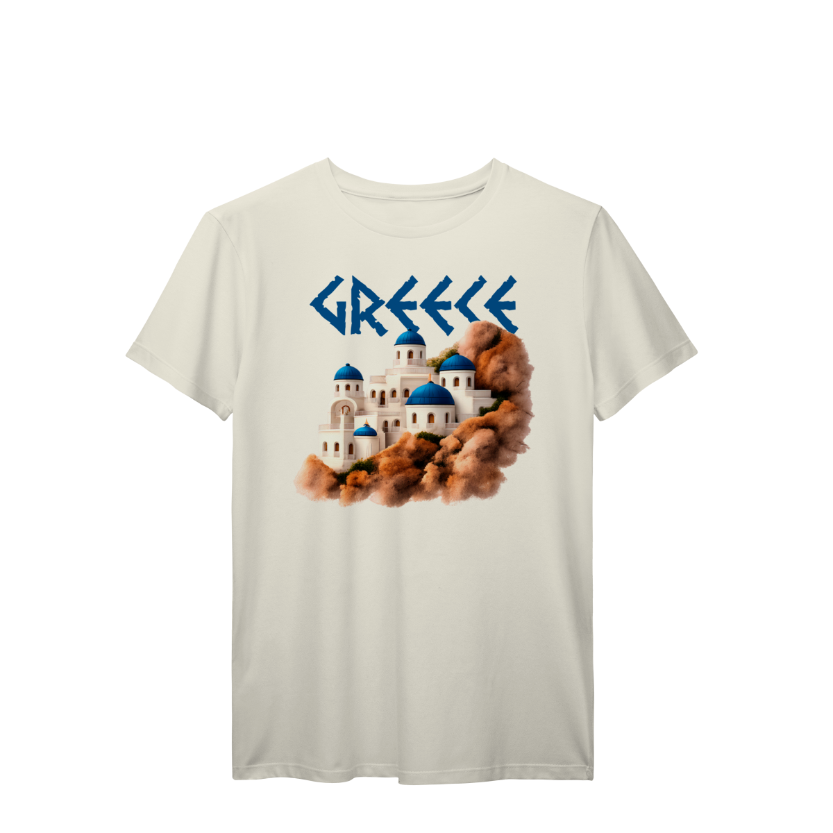 Com a palavra "GREECE" em destaque e uma ilustração encantadora das icônicas construções de Santorini — domos azuis e paredes brancas sobre rochas terrosas — esta camiseta é uma verdadeira homenagem à beleza arquitetônica e cultural da Grécia. Ideal para quem ama viajar, sonhar ou simplesmente vestir arte e história.